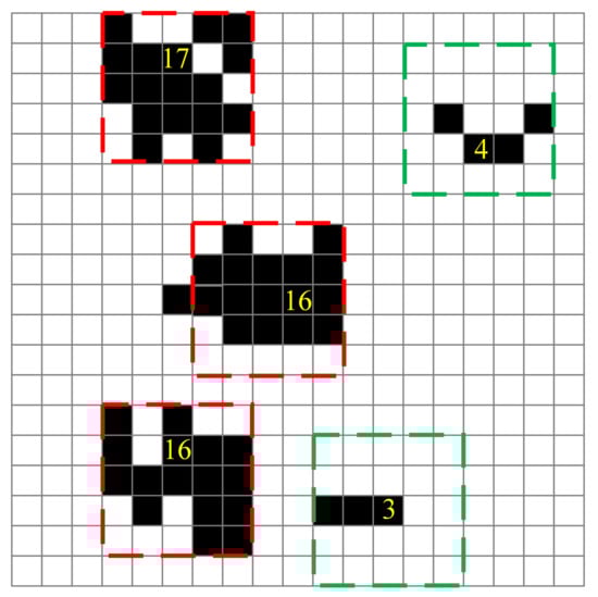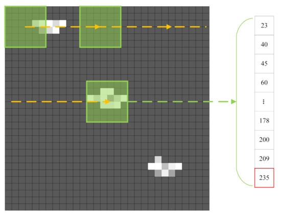 As shown in Figure 3, the number of pixels contained in different windows varies. By calculating the pixel spatial density, the windows with higher density are detected by combining the predefined density threshold to obtain the set of candidate transmission tower pixels. Taking the threshold = 16 as an example, Figure 3 shows the calculation of the pixel spatial density for candidate transmission tower pixels, in which the interfering pixels in the two green square windows will be filtered out. Therefore, the index set of candidate transmission tower pixels can be expressed as . By statistical analysis of the image, can be obtained as follows: