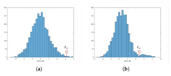 where is the probability density function (pdf) of the Gaussian mixture model, is the weight, and are the mean and variance of kth class, , and can be calculated by Expectation-Maximization (EM) algorithm. The threshold is chosen according to the Gaussian mixture model distribution at the wave crest corresponding to the maximum and next largest . Without loss of generality, ’s, k = 1,…, K, are arranged in ascending order. Thus, it can be said that the SCR threshold is between K-1 and K (K > 2) means. To be accurate, SCR threshold can be calculated as follows,