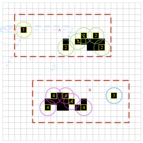 The schematic diagram of candidate transmission tower pixels grouped into several quasi-transmission towers is shown in Figure 4. Observing Figure 4, which contains two sets of candidate transmission tower pixels, A and B. The single pixel marked as #1 in A is considered as interference background pixels, so is #3 in B. Therefore, the two groups of pixels labeled #2 and #4 in A and B constitute two quasi-transmission towers, respectively. The proposed method can effectively filter out the independent interference pixels around the transmission towers.