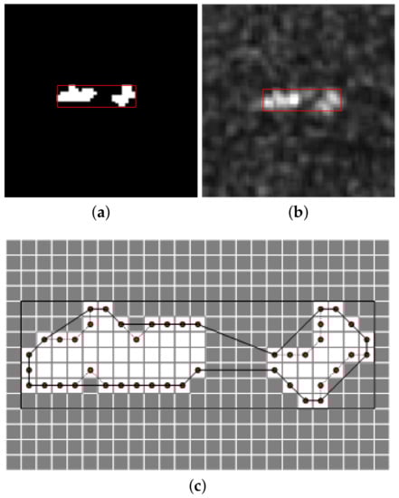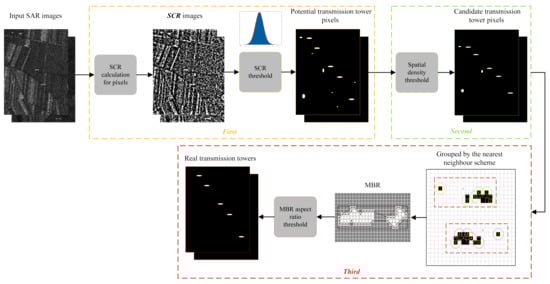 This paper proposes a hierarchical algorithm from high-resolution SAR images. First, the Signal-to-Clutter Ratio (SCR) [38] features of the transmission towers in SAR images are used to extract the potential transmission tower pixels, which is different from the above literature that constructs an a priori model to detect the transmission towers. Secondly, based on the aggregation characteristics of transmission tower pixels, some potential transmission tower pixels with small spatial density are eliminated, and the remaining potential transmission tower pixels are considered as candidate transmission tower pixels. Finally, the convex-hulls [39] of quasi-transmission towers are generated by calculating the minimum distance between the candidate transmission tower pixel pairs, grouping the quasi-transmission tower pixel groups, and generating their minimum bounding rectangles (MBRs) [40]. The MBR aspect ratio extraction criterion is set according to the actual size of the transmission tower and its imaging morphology in the SAR images to complete the accurate extraction of transmission tower. Fast, robust and effective detection of transmission towers is realized to meet the detection needs of transmission towers.