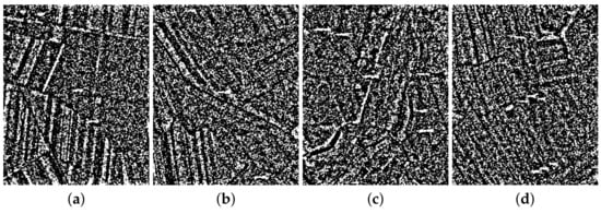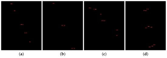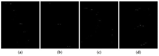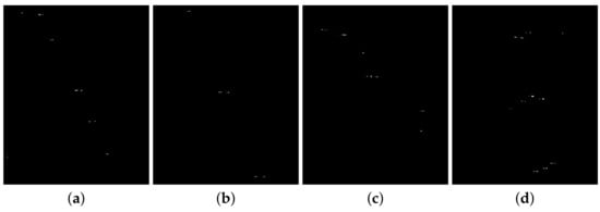 By calculating the spatial densities of potential transmission tower pixels, candidate transmission tower pixels can be obtained by thresholding the densities. Observing the detection results in Figure 10, the transmission tower pixels have obvious spatial aggregation. According to Formula (5), the density threshold ranges of Figure 10a–d are set to 18–66. Therefore, Figure 12a–d show the candidate transmission tower pixels by thresholding the densities of potential transmission tower pixels in Figure 10a–d, respectively. Observing Figure 12, it can be noticed that most of the false alarm pixels have been filtered out and only a few pixels are detected as candidates for the number of transmission tower pixels. Additionally, all the transmission tower main pixels within the four images have also been retained, which verifies the effectiveness of the density thresholding algorithm.