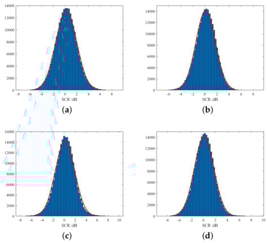 Figure 8 shows the normalized image results, with white pixels the high SCR region and black pixels the low SCR region. As seen in Figure 8, the detail information within the SCR image is stronger than that of the original image. Although the transmission tower is hidden in a large amount of background clutter, it can be seen using Formula (1) that the proposed algorithm fully considers the relationship between transmission tower pixels and neighboring pixels, and has a stronger SCR value compared to other white background pixel clutter. Figure 9a–d show the histograms of the images corresponding to Figure 8a–d, respectively, and fitted Gaussian distribution curves (in red) to the histograms. According to Formula (3), the SCR thresholds can be calculated as 5.70, 4.63, 6.32 and 5.72 for the images shown in Figure 9a–d, respectively.