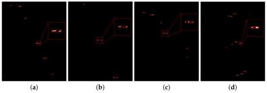 Figure 10a–d show the potential transmission tower pixels by thresholding the SCR images in Figure 8a–d, respectively. It can be seen from Figure 10a–d, for each transmission tower, there are always part of its pixels being detected, although there are still some false alarm pixels in the potential transmission tower pixels. Figure 11a–h show the results using gray threshold method with different threshold in Figure 7a–d, respectively. Comparing the detection results of the two methods, it is found that the detection using images is more advantageous compared to the original images. A large number of background interference pixels are removed while ensuring that transmission towers are not missed, and the geometry of transmission tower pixels is preserved. Taking the transmission tower in Figure 10a as an example, a red box is used to mark the corresponding location of the transmission tower and it is zoomed in to show that the pixel distribution and geometry of the transmission tower can be clearly observed without losing important component pixels. However, when the threshold is increased, most of the transmission tower pixels are filtered out, leaving only a few main pixels, as shown in Figure 11e–h. Among them, by observing Figure 11f, it can be found that the geometry of the transmission tower cannot be identified, and a transmission tower is missed in Figure 11h. Therefore, a comparison with Figure 11 indicates that the proposed algorithm is not simply and irregularly filtered by the amplitude values.