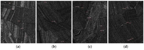 In the experiment, C-band HH-polarization GF-3 amplitude images are employed to validate the proposed algorithm. Figure 7 shows the experimental images with sizes of 535 × 433 pixels, where Figure 7a shows a farmland with 8 m resolution, located in Shenyang City, China, and contains five transmission towers; Figure 7b–d show farmland and wasteland with 3 m resolution, located in Fuxin City, China, and contain three, five and nine transmission towers, respectively.