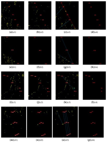 Figure 17 shows results from the comparison algorithms for transmission towers detection in Figure 7a–d. Among them, Figure 17(a1)–(d1) show the results of Log-normal distribution of CFAR detection algorithm. Figure 17(a2)–(d2) show the results of the combined CFAR and EF algorithm. Figure 17(a3)–(d3) show the results of and the combined CFAR and Contrario algorithm. Additionally, Figure 17(a4)–(d4) show the results of the proposed algorithm. In Figure 17, the red and yellow rectangle marks the real and false alarm transmission towers, respectively, and the green oval marks the missed detection transmission towers.