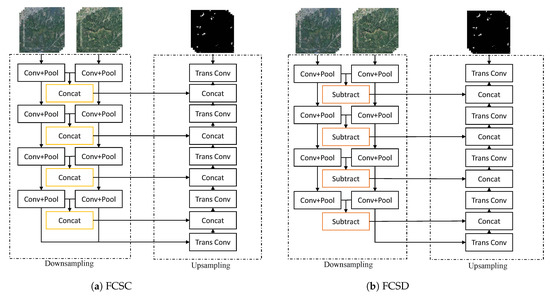 - Differences between FCDD and FCGD. As two types of Siamese neural network, FCDD and FCGD have obvious differences in the theoretical method and experiment results. In the theoretical method, FCDD has a concatenation weight sharing mode in the top layer of downsampling process, while the other layers are made by subtract weight sharing mode. In the downsampling process of FCGD, the top layer is a subtract weight sharing mode, and the other layers are a concatenate weight sharing mode. In the experiment results, FCDD has better capability of noise eliminating than FCGD, such as shrub wither and grass wilt. The subtract weight sharing mode in the more subtle convolutional layers gives FCDD better forest cover change detection ability. As the break-even point of precision and recall, F-measure shows the quantitative performance measure of predict results. FCDD has the best F-measure score in forest decrease and increase extraction experiments, following by FCSC and FCGD. This difference approves that given the same forest change image, FCDD has better ability in predicting forest cover change than FCGD.