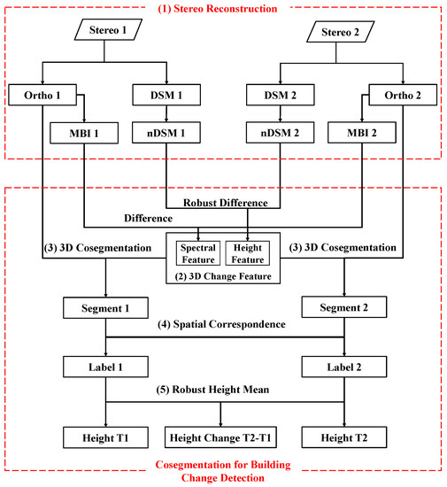 This section will introduce the proposed 3D-co-segmentation-based urban buildings change detection algorithm in detail. The workflow of the proposed method is shown in Figure 1. The inputs of the algorithm are two pairs of satellite stereo images with changes. After the dense image matching, we can obtain the DSMs as well as the orthorectified images of the two-temporal and extract the nDSM from the DSM. Then, the spectral change feature is extracted through MBI [40,41] difference, and the height change feature is extracted through the robust height difference of nDSM. The 3D co-segmentation is then done using the same 3D change feature as the prior knowledge and the spatially associated segmentation results corresponding to two-temporal orthoimages are acquired. After that, the overlay analysis is applied to the two-temporal segmentation results, and the object-to-object correspondences of the changed objects are determined. Finally, the height change values of each changed building are calculated using the robust height means.