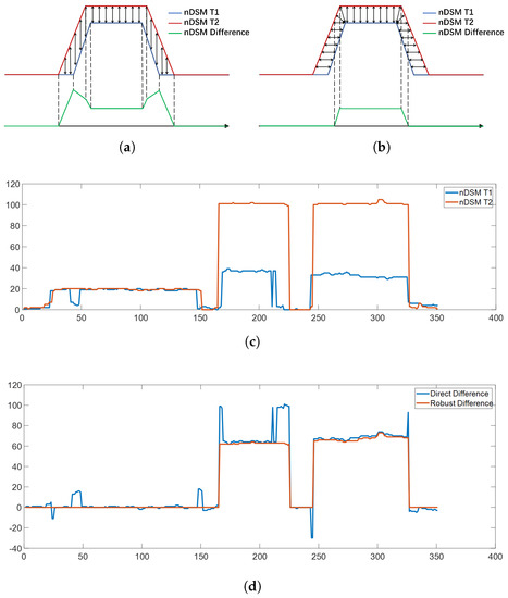 The schematic diagrams of (a) directed difference and (b) robust difference, and the profiles of (c) nDSMs and (d) height differences.