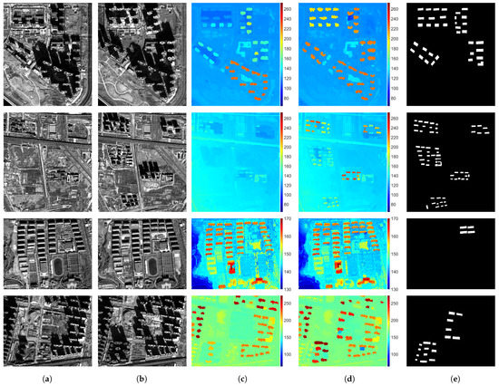 Stereo reconstruction results of dataset 1, Test areas 1–4: (a) Orthorectified panchromatic image from T1; (b) Orthorectified panchromatic image from T2; (c) DSM from T1; (d) DSM from T2; (e) Ground truth.