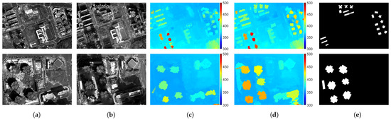 Stereo reconstruction results of dataset 2, Test areas 5–6: (a) Orthorectified panchromatic image from T1; (b) Orthorectified panchromatic image from T2; (c) DSM from T1; (d) DSM from T2; (e) Ground truth.