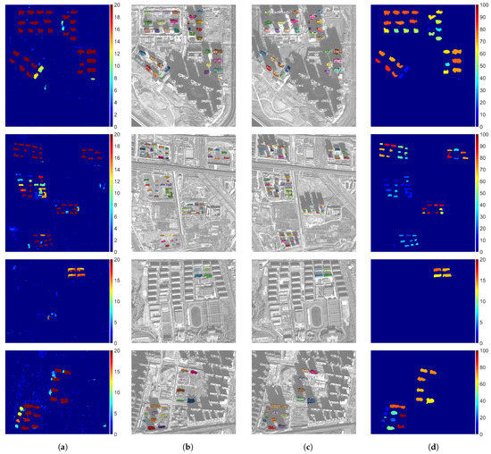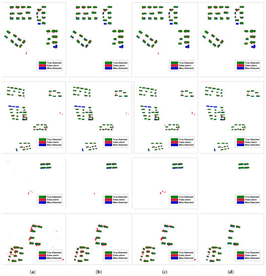 Result evaluation of dataset 1, Test areas 1–4. (a) Results of threshold segmentation of height change map using threshold ; (b) Results of belief function-based DS fusion method; (c) Results of graph-cut based DSM segmentation method; (d) Results of the proposed method. The green color represents true detection. The red color represents false alarms. The blue color represents missed detected.