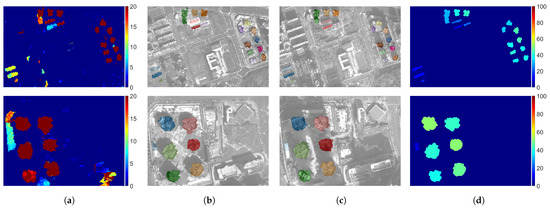 Experiment results of dataset 2, Test areas 5–6: (a) Robust difference value of nDSM; (b,c) Detected changed buildings at T1 & T2, same colors represent corresponding changed buildings; (d) Height change values of changed buildings between T1 and T2.