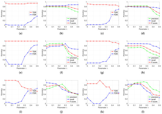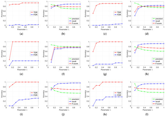 Influence of on co-segmentation accuracy. (a,c,e,g,i,k) Influence of on TDR and FNR for Test areas 1–6; (b,d,f,h,j,l) Influence of on precision, recall and for Test areas 1–6.