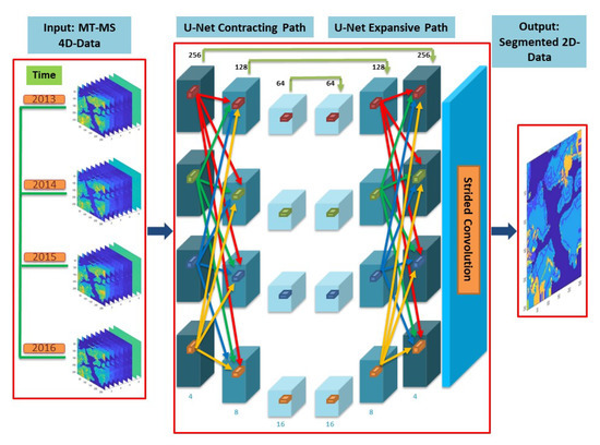 As illustrated in Figure 2, in order to efficiently train our 4D U-Net model, we feed it with raw MT-RS imagery (i.e., sequences of 3D MS data), without any data pre-processing/collapsing step. Those sample images are passed through a series of high-dimensional operations (e.g., convolution, pooling, upsampling) encapsulated in the U-Net model, which become more complex as the depth of the network increases (i.e., the number of filters at the bottom of each module increases accordingly). At the same time, spatial information (i.e., the spatial size at the top of each module) is sequentially downsampled and upsampled in order to derive more representative features, while the spectral and temporal information are preserved up to the final classification module of the network. Unlike lower-order models, which have to collapse data information before training the network, our proposed architecture exploits all high-dimensional information by performing all operations in the nominal data dimensions. Experimental results on real MT-RS images demonstrate that directly learning features employing all available data dimensions, rather than selecting, averaging, or even collapsing some of them, achieves a significantly higher accuracy level, indicating the efficacy of the proposed approach.