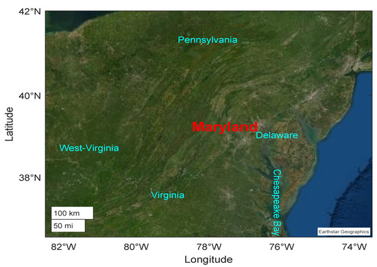 Visualization of the area under study, in terms of geographic location and global basemap. Maryland state, located in East Coast USA, includes several vegetation as well as forest-dominated areas.