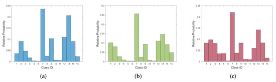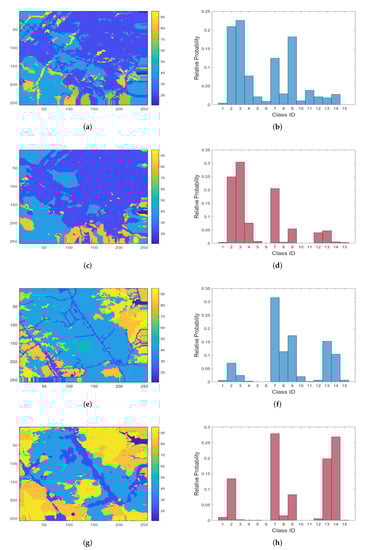 Since our task is to classify every pixel in an MT-RS image (and not the whole image itself), it is to be expected that the dataset is going to be imbalanced. Such a case is common in pixel-level classification tasks, as a direct consequence of non-uniform label distribution among different sample MT-RS images in real-world datasets. Figure 6 depicts the normalized histogram of the different classes present in every different set (i.e., training-validation-test), clearly showing the imbalanced label distribution. We observe that some classes are quite infrequent (e.g., barren land, shrub/scrub), whereas some others dominate the dataset (e.g., deciduous forest with a relative probability of almost ).