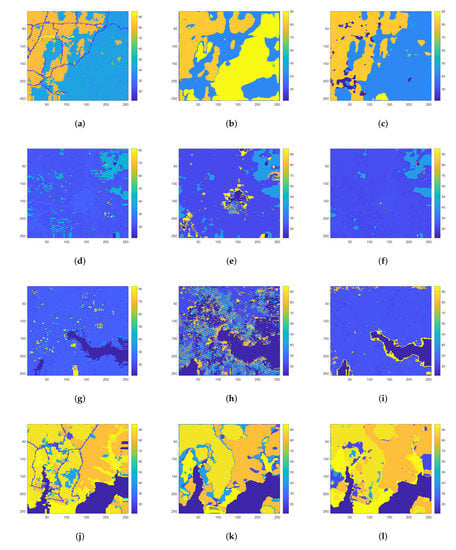 Overview of the label-tiles used for training (left column), validation (middle column), and test (right column) of the models. Different tiles are composed of different labels’ distributions, indicating the difficulty of the problem at hand. (a) Training Set-Tile 171. (b) Validation Set-Tile 2388. (c) Test Set-Tile 224. (d) Training Set-Tile 380. (e) Validation Set-Tile 2551. (f) Test Set-Tile 3244. (g) Training Set-Tile 3376. (h) Validation Set-Tile 3035. (i) Test Set-Tile 3264. (j) Training Set-Tile 3663. (k) Validation Set-Tile 3118. (l) Test Set-Tile 3976.