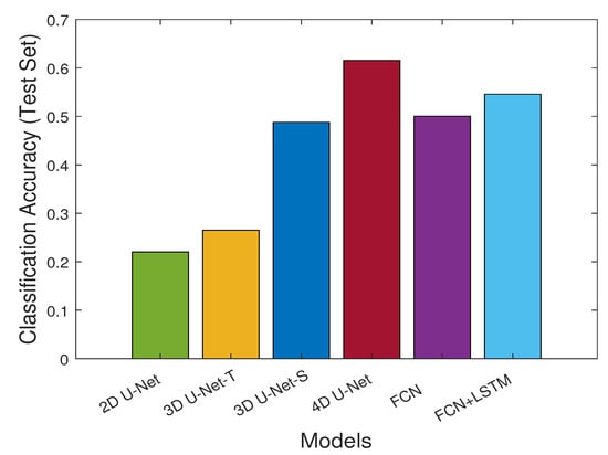 A final comparison between all employed methods is shown in Figure 13, which depicts the classification accuracy obtained in the test set by the four considered U-Net models, together with the FCN and FCN + LSTM methods. Among the U-Net variants, our proposed 4D model achieves the best classification accuracy () among all, followed by the 3D U-Net-S model (), the 3D U-Net-T model (), and finally the 2D U-Net model (). Moreover, both the FCN and FCN + LSTM outperform the lower-order U-Nets as they achieve a classification accuracy of and , respectively. Still, they remain at least below the proposed 4D U-Net model. All in all, the designed higher-order architecture clearly outperforms all its competitors in every experimental scenario examined.
