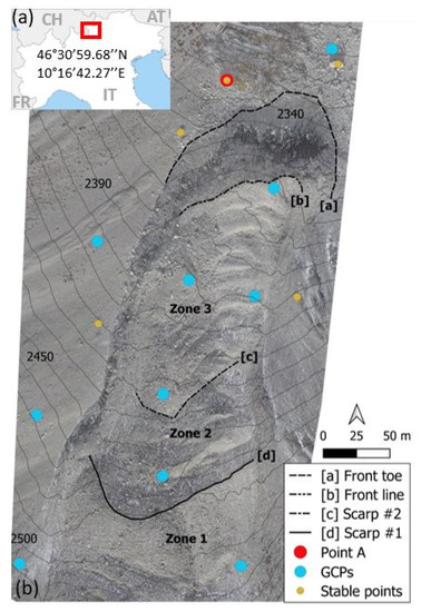 (a) Location of the study site in the Central Italian Alps. The coordinates of the rock glacier site are given in the WGS 84 coordinates system. (b) Orthophoto showing the three zones subdivision, the location of the two scarps [c] and [d], the front line [b] and the front toe [a], the bedrock outcrop and veener in Point A (i.e., position of GNSS/RTK base station, 2337 m a.s.l.), Ground Control Points (GCPs) distribution and five stable points. Image refers to the year 2016.
