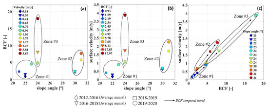Figure 3 shows the surface velocity as a function of the BCF and the surface slope angle for Zones #1, #2, and #3 in the periods 2012–2016, 2016–2018, 2018–2019, and 2019–2020. For the multiannual intervals (2012–2016 and 2016–2018), the values of velocity, slope, and BCF refer to the annual average of the given period.