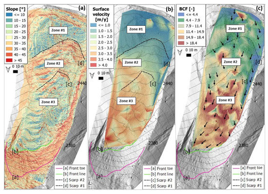 In Figure 4, the spatial distribution of the surface slope angles (Figure 4a), the surface velocities (Figure 4b), and the BCF values (Figure 4c) for the most recent time interval are shown (2019–2020). The rooting zone (Zone #1) is the area where the minimum values of all these three parameters were found. Here, the mean surface velocity was lower than one metre per year, the mean BCF representative of the area was 4.6, and the average slope was 23°. The mean BCF value increased (7.7) in Zone #2 as well as the average slope (31°) and the creep rate, which reached 2.3 m/y. A further increase in surface creep rate was seen in Zone #3, with values of almost 4 m/y, which was also associated with an increase in BCF, almost reaching a value of 18. On the contrary, the average surface slope angle (24°) was lower than that calculated for Zone #2.