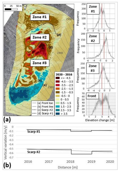 (a) DSM of differences (DoD) between 2016 and 2020 (left) and the associated frequency distributions of vertical changes (m) of the three zones and of the front part in the period 2016–2020 (right). The red dotted lines represent the mean difference. Please note the different axis scales for the four zones. (b) Mean annual vertical variations of scarps #1 and #2 with the respective linear regressions (black dotted lines). Period between 2016 and 2020.