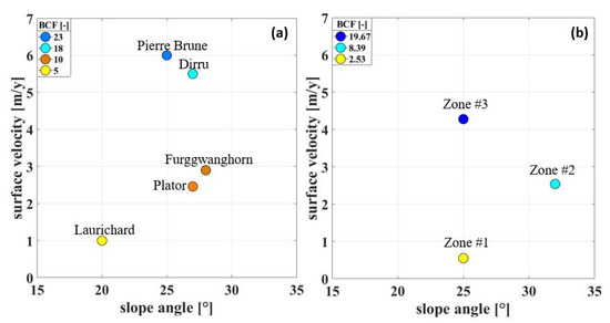 (a) Representation of the Plator rock glacier together with other rock glaciers (Pierre Brune, Dirru, Furggwanghorn, and Laurichard). The position of the individual rock glaciers in the graph depends on the values of the relationship BCF, slope angle, and surface velocity; (b) Representation of Zones #1, #2, and #3 of the Plator rock glacier considering BCF, slope angle, and surface velocity in the period 2019–2020.