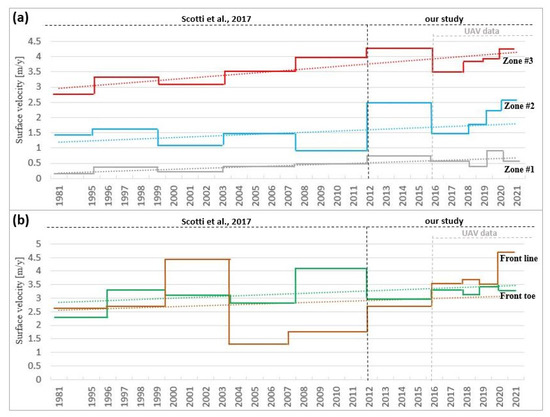 Horizontal surface velocities from 1981 to 2020 for: (a) Zone #1, Zone #2, and Zone #3; (b) Front line and front toe. The coloured dotted lines indicate the linear regression for each time series.