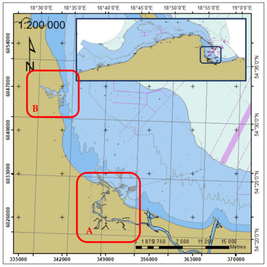 Location of sound speed in water and depth measurements: in Gdańsk (A) and Gdynia (B).