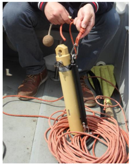 The presented mathematical relations serving to determine the sound speed in water employ the measured values of the temperature and salinity as a function to the depth, which is determined on the basis of hydrostatic pressure. The temperature measurement is easy and inexpensive. For this reason, one may use a laboratory thermometer of limited measuring range, with a probe on a long cable (Figure 2). The measurement is performed by reading the temperature at the depth of the probe immersion, and the depth is recorded by marking the cable with tracers.