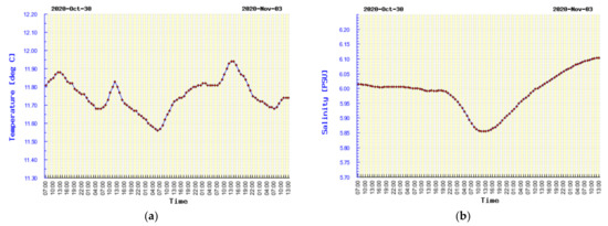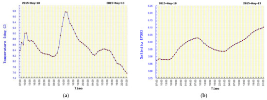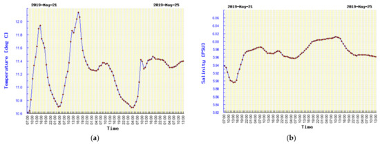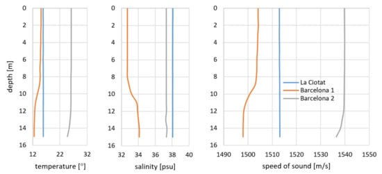 Time courses of water basic parameters: temperature and salinity are presented in Figure 5. A three-day range of changes of these parameters is not high, and it varies in the range of Δt = 1.5 °C and ΔS = 0.5 psu. A value of S = 6 psu has been set to determine the sound velocity in water.