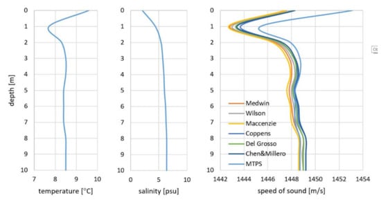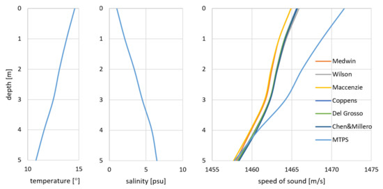 Based on the registered water parameters, one may observe a change of both temperature and salinity. Along with the depth growth, the temperature decreases within the range of 14.6–10.8 °C and the salinity within the range of 1–6.5 psu. It results in the sound speed change within the range of 1465–1458 m/s. With the assumption that the salinity is 6 psu, the difference between the determined sound velocity in water and its value obtained from the measurements of the temperature and salinity is the highest near the surface, when the salinity variation is the biggest.