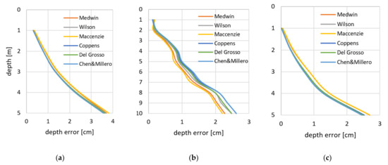 Table 8 shows the depth error as a difference between the depth determined using vertical distribution of the sound speed and on the basis of the simplified method with constant salinity S = 6 psu in the Martwa Wisła River. In the depth range of 0–10 m, the difference is no more than 2.5 cm.