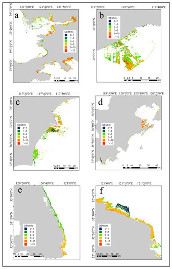 Hypsometry of newly reclaimed land in (a) Dalian; (b) Tangshan; (c) Tianjin; (d) Qingdao; (e) Yancheng; and (f) Nantong.