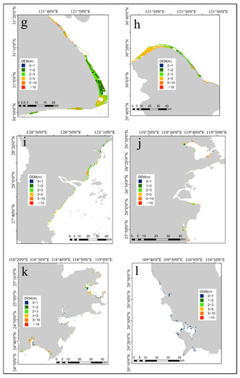 Hypsometry of newly reclaimed land in (g) Shanghai; (h) Ningbo; (i) Wenzhou; (j) Fuzhou; (k) Quanzhou; and (l) Zhanjiang.