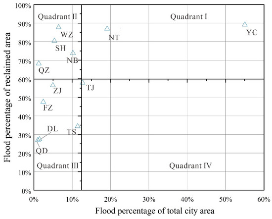 Overall, 12.42% of the total land in all cities considered will be flooded under extreme sea level, and this impact will be more intense in newly reclaimed land, of which 59.85% (1895.82 km2) will be flooded Table 3. In particular, the inundation proportion of reclaimed land was highest in Yancheng (89.17%), followed by Wenzhou (87.72%), Nantong (86.92%), and Shanghai (80.45%). Yancheng borders Nantong to the south. The average elevation of these two cities is low (2.74 m and 4.05 m, respectively); in these locations, as shown in Table 3 and Figure 5 the inundation proportion of the entire city area is also very high (55.01% and 19.13%, respectively). In addition, Yancheng–Nantong includes a large area of aquaculture ponds and silty-sandy beach within reclaimed lands, and there are extensive deep-water (>4 m) flooded areas (Figure 6e,f). Conversely, for Shanghai and Wenzhou, the inundation proportion of the entire city is only about 6%, far less than reclaimed regions (approx. 85%). Table 3 and Figure 5 show that Ningbo and Quanzhou have a similar inundation proportion for reclaimed regions (approx. 70%). Ningbo’s floodplain is concentrated in the north (Figure 7h), and its total inundation area (333.13 km2) ranked second in our list. However, Quanzhou’s inundation area (70.64 km2) is relatively small. For Tangshan–Tianjin, most coastal wharves will be submerged (Figure 6b,c), and about 12% of the total city area will be flooded. As shown in Table 3, for Dalian and Qingdao, flood areas, flood percentage of the whole city area, and flood percentage of the reclaimed area were relatively low due to high average elevations (81.9 m and 55.1 m, respectively). The last column in Table 3 shows the effects of elevation changes in newly reclaimed land on flood inundation. Based on this index, we categorized these cities into four groups. For Dalain, >90% of the flood inundation occurred in newly reclaimed lands; followed by Quanzhou, Shanghai, and Ningbo (>35% and <50%); then, Qingdao, Nantong, Wenzhou, Fuzhou (>15% and <25%); and Tianjin, Tangshan, Zhanjiang, and Yancheng, where <10% of the flood inundation occurred in the newly reclaimed land.