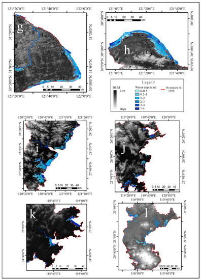 Inundation map under a 100-year return period flood for (g) Shanghai; (h) Ningbo; (i) Wenzhou; (j) Fuzhou; (k) Quanzhou; and (l) Zhanjiang.
