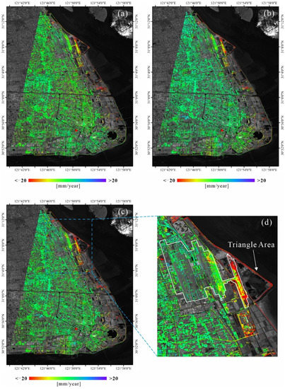 - Chen, J.; Wu, J.; Zhang, L.; Zou, J.; Liu, G.; Zhang, R.; Yu, B. Deformation trend extraction based on multi-temporal insar in shanghai. Remote Sens. 2013, 5, 1774–1786. [Google Scholar] [CrossRef] [Green Version]