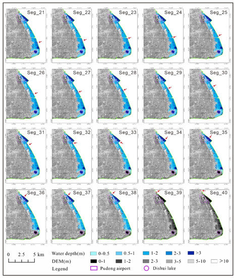 Following Section 2, we split the coastline seawalls into forty non-overlapping segments and estimated the probability of wave overtopping and flood impacts in the case of an extreme weather event under the failure of each individual segment by considering the relevant seawall height and Equations (1) and (2). The impact is calculated by applying the LISFLOOD-FP hydrodynamic model [57,58], assuming that, for every selected sector, incoming waves overpass the barriers and the seawall sector has a severe failure. The worst-case where the seawall is destroyed was also considered in the simulations. The combined CSK/S-1 2018–2021 mean Up–Down ground deformation rates (see Figure 9) were also used to obtain rough estimates of the seawall height corrections due to subsidence for ten years from now (i.e., in 2030). However, the observed ground deformation (subsidence) rates along the Shanghai coastline from 2018 to 2021, which agreed with what was expected from previous work [105], were to the order of a few centimeters per year. Accordingly, the applied seawall height corrections did not significantly affect the estimates of the wave overtopping probabilities (see Equation (3)), and only marginally changed projections for the areas where the subsidence rate was higher (Figure 9). Overall, the probability of wave overtopping remains very low in the northern sectors and more significant in the southern coastal sectors where the seawalls are lower. The simulation results that considered the failure of each segment are shown in Figure 11 and Figure 12.