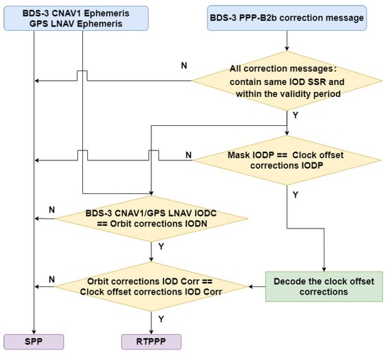 To ensure the correct matching between the correction information and the broadcast ephemeris, the Issue of Data (IOD) is employed as a matching indicator. These IODs include: IOD of state space representation (IOD SSR), IOD of pseudo-random noise mask (IODP), and IOD of navigation (IODN), as well as the IOD of orbit and clock corrections (IOD Corr). The matching strategy is illustrated in Figure 1. It should be noted that the DCB parameter is not included in this matching strategy because it does not change within a day.