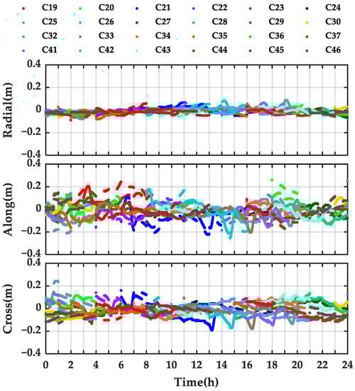 The PPP-B2b orbit correction sequences of the MEO satellites of BDS-3 decoded from the PPP-B2b message on 9 August 2021 (DoY 221) are shown in Figure 2. The variations in orbit correction sequence for MEO satellites are within 0.1, 0.3, and 0.3 m in radial, along-track, and cross-track components, respectively. The centimeter-level corrections indicate that considerable accuracy could be achieved by the broadcast orbits of BDS-3 MEO satellites, which mainly benefits from the application of inter-satellite links (ISL) technology [38]. Figure 2 also reveals the hourly discontinuity of the orbit correction series, which is related to the hourly update of the broadcast ephemeris [39].