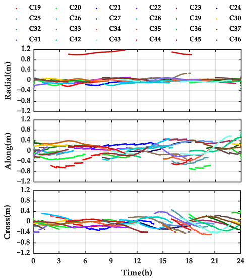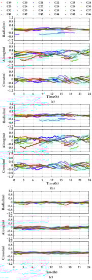 The real-time orbit errors in radial, along-track, and cross-track components for the PPP-B2b referenced to the final precise orbit from GFZ are presented in Figure 3a, and those of broadcast ephemeris are presented in Figure 3b. The WHU real-time orbit errors referenced to GFZ final products are plotted in Figure 3c. The orbit errors for both real-time PPP-B2b orbit and broadcast orbit exhibit the same level of accuracy. The real-time orbit error series of PPP-B2b is smoother and more continuous than that of the broadcast orbit error. The orbit error of WHU real-time product is more continuous and smoother, and more consistent with the GFZ final orbit product. The satellite orbit errors of C41 and C42 of the PPP-B2b real-time orbits show some abnormal errors with 0.6 m in radial components, compared to the final precise orbit from GFZ. The significant difference in the orbits between the PPP-B2b and that of GFZ may relate to the PCO corrections released by IGS. To further analyze this orbit bias, the orbit errors in radial, along-track, and cross-track components that apply the PCO corrections provided by China Satellite Navigation Office (CSNO) are presented in Figure 4. The abnormal orbit error of the satellites C41 and C42 no longer exist, but satellite orbit C44 appeared to have a significant bias, with about 1 m, on the radial component. Thus, the significant biases on satellite orbits are related to difference in the PCO corrections, which do not participate in real-time PPP solutions with PPP-B2b signals.
