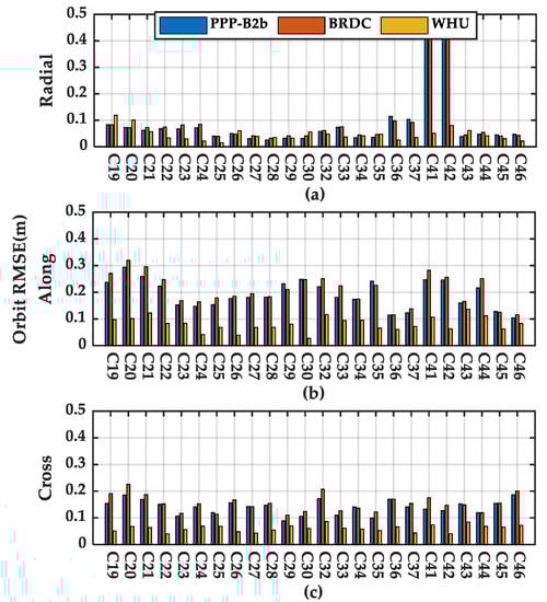 To further evaluate the accuracy of satellite orbits of PPP-B2b products, the Root Mean Square Error (RMSE) of PPP-B2b real-time orbits, broadcast orbits, and real-time orbits from WHU based on a 7-day dataset (6–12 August 2020) are presented in Figure 5. The RMSE of different satellite orbits also indicates that the radial components of both PPP-B2b orbit and broadcast orbit have better performance than that of the along-track and cross-track components. The higher accuracy on the radial component is mainly related to the high-quality onboard hydrogen and rubidium clocks, which compensate for the systematic error in the radial component [31]. The corresponding average RMSEs of the BDS-3 MEO satellites are listed in Table 2. The average RMSE of PPP-B2b orbits is 8.5, 19.3, 14.0 cm in radial, along-track, and cross-track components, respectively. The difference between the PPP-B2b orbit and the broadcast orbit is only centimeter-level. This slight accuracy improvement may be related to the better continuity of the PPP-B2b orbit than that of the broadcast orbit. The WHU real-time orbits exhibit better accuracy than that of PPP-B2b orbits. The RMSE of WHU real-time orbits on radial, along-track, and cross-track components are 4.6, 8.1, and 6.1 cm, respectively. The better accuracy of the WHU real-time orbit is mainly benefited by the global GNSS network, while the PPP-B2b service only relies on the regional monitoring stations in China.