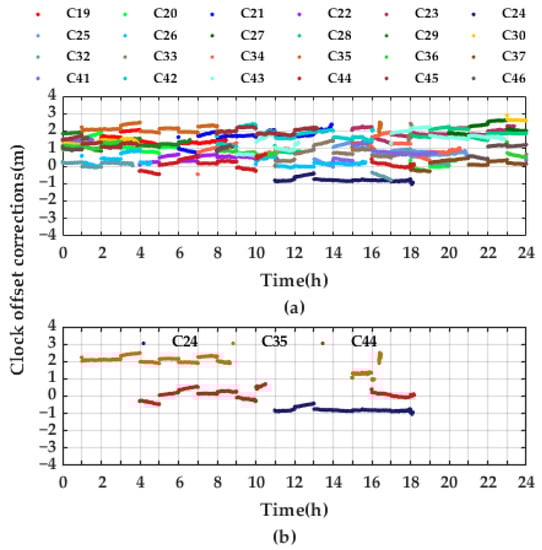 The PPP-B2b clock offset correction sequences of BDS-3 MEO satellites on DoY 221 are shown in Figure 6a. The PPP-B2b clock offset corrections of each satellite are within 3 m and contain systematic offsets. The details of clock offset correction parameters of satellites C24, C35, and C44 are presented in Figure 6b. It is easy to find that the corrections of these three satellites fluctuate around constant values of about −1, 2, and 0 m, respectively. The corrections also exhibit discontinuity in hourly duration, which is also consistent with the update frequency of the broadcast ephemeris.
