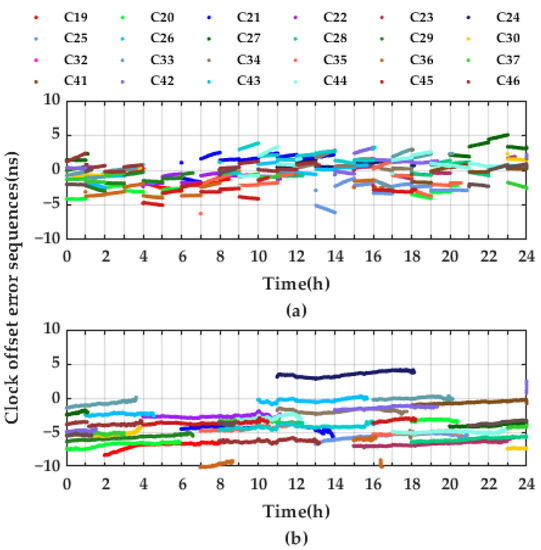 Figure 7. Satellite clock offset error sequences of broadcast clock offset (a) and PPP-B2b clock offset (b).