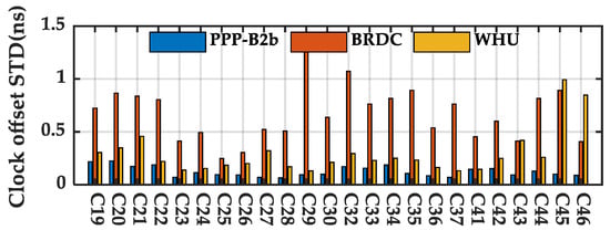As the satellite-specified systematic errors existed in the BDS-3 real-time clock products, the STD values acquired from re-edited error sequences of BDS-3 MEO satellites over a 7-day period are summarized and presented in Figure 9. The STD of PPP-B2b clock offsets is within 0.25 ns. The average STD of the PPP-B2b clock offsets is 0.124 ns, which is significantly improved compared to that of the broadcast clock offsets with the STD of 0.672 ns. The average STD of PPP-B2b clock offsets is also smaller than that of WHU real-time clock product, which is 0.360 ns.