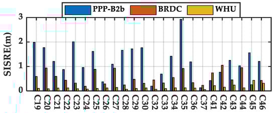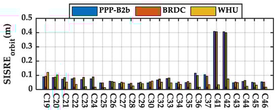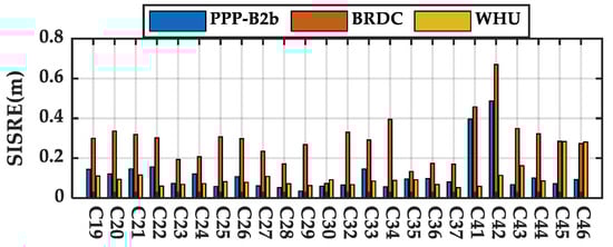 The RMSs of SISRE and orbit only SISRE, as well as the STD of SISRE of broadcast ephemeris, PPP-B2b and WHU real-time products for BDS-3 MEO satellites during the 7d test period were calculated. The RMS SISRE of each satellite is plotted in Figure 10. The average RMS SISRE of broadcast ephemeris, PPP-B2b corrected products, and the real-time products from WHU are 0.536, 1.242, and 0.137 m, respectively. The largest SISRE of PPP-B2b occurred in satellite C35 with a value of 2.93 m, due to its outlying real-time clock offset with a value of 5 ns. The orbit only SISRE is plotted in Figure 11. The results show that the orbit only SISRE of PPP-B2b is similar to that of WHU real-time product. The abnormal SISRE value of PPP-B2b and the broadcast ephemeris on C41 and C42 are caused by PCO corrections. Thus, it can be confirmed that the large RMS SISRE value of PPP-B2b corrected products is mainly caused by the satellite-specified systematic error on clock offset. To exclude the systematic error effect on SISRE evaluation, the STD SISRE is also calculated and presented in Figure 12. The average STD SISRE of PPP-B2b is 0.097 m, which is similar to that of WHU real-time product. The average SISRE values are summarized in Table 3.