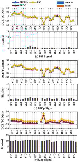 Figure 13. DCB or TGD corrections and corresponding bias of B1I signal (a), B1Cp signal (b), and B2ap signal (c).