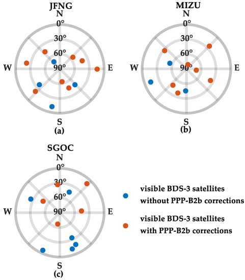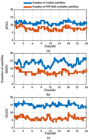 Figure 15. Number of visible satellites and number of PPP-B2b available satellites of (a) JFNG, (b) MIZU, and (c) SGOC.