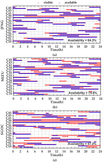 Figure 16. The visible satellites, the PPP-B2b available satellites, and the corresponding availability on DoY 221 of JFNG (a), MIZU (b), and SGOC (c).